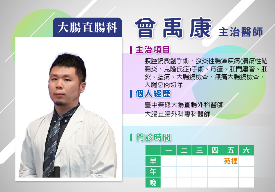 肝膽結石、蘭尾炎、腸胃腫瘤、大腸直腸腫瘤、疝氣、痔瘡、瘻管、膿瘍的診斷、手術治療 大腸直腸癌的手術治療、化學治療、標靶療法、直腸脫肛、治療各種大腸、直腸、肛門疾病肛門鏡、人工造口照護