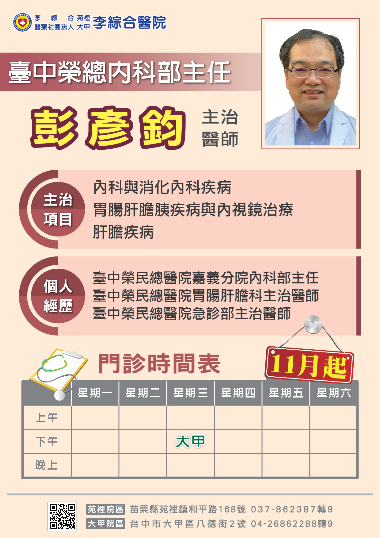 【好消息】特聘臺中榮總 肝膽腸胃科 彭彥鈞醫師駐診
